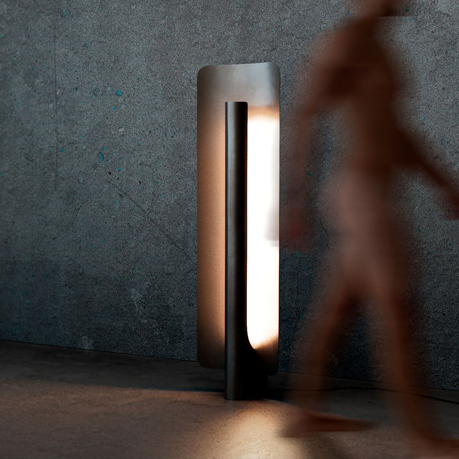 La AO Floor Lamp nace de una fina lámina de acero. Mediante corte láser conseguimos dos piezas que, al curvarse, permiten un sólido encaje en seco; sin soldaduras ni herrajes.